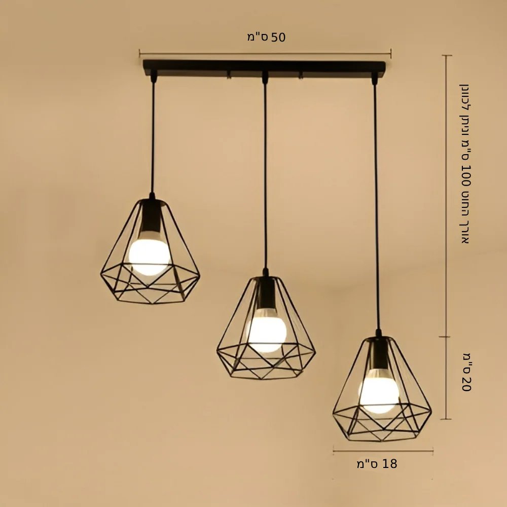 דגם 'יהלום' | מנורת תלייה שלשייה בסיס מלבני | וינטאג' גאומטרי | שחור